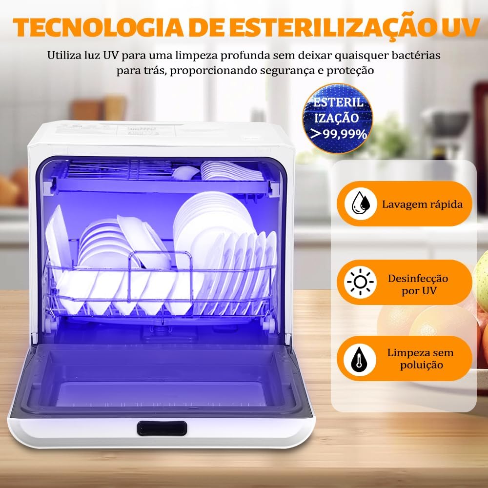 Esta máquina de lavar louça consome apenas 0,35 kWh de eletricidade por ciclo de lavagem e usa apenas 5 L de água, uma economia de até 80% em comparação com a lavagem à mão, perfeita para um estilo de vida mais sustentável.